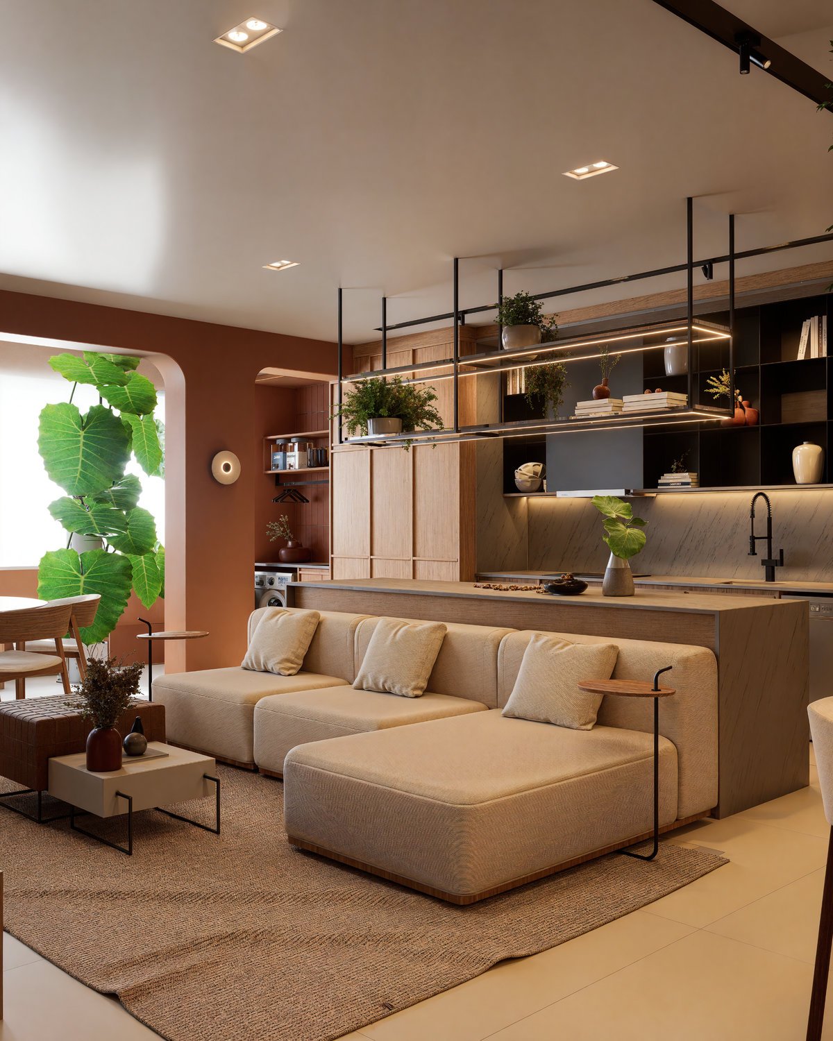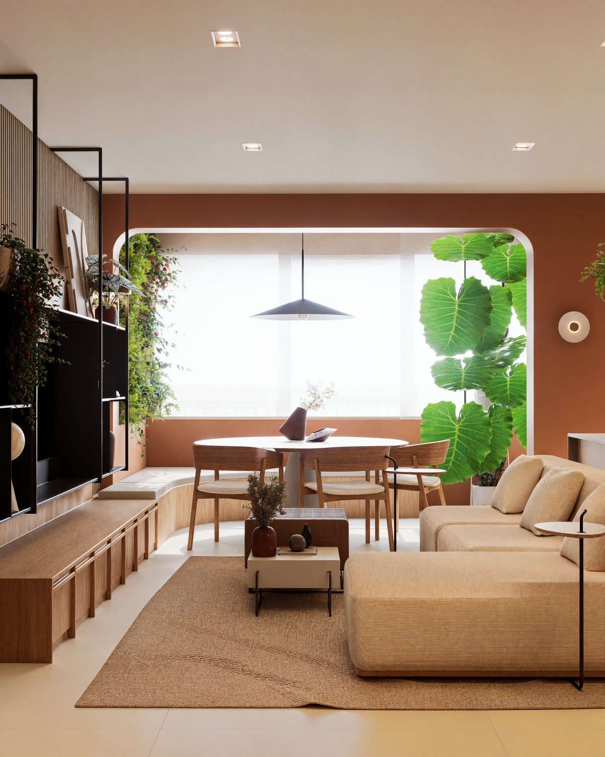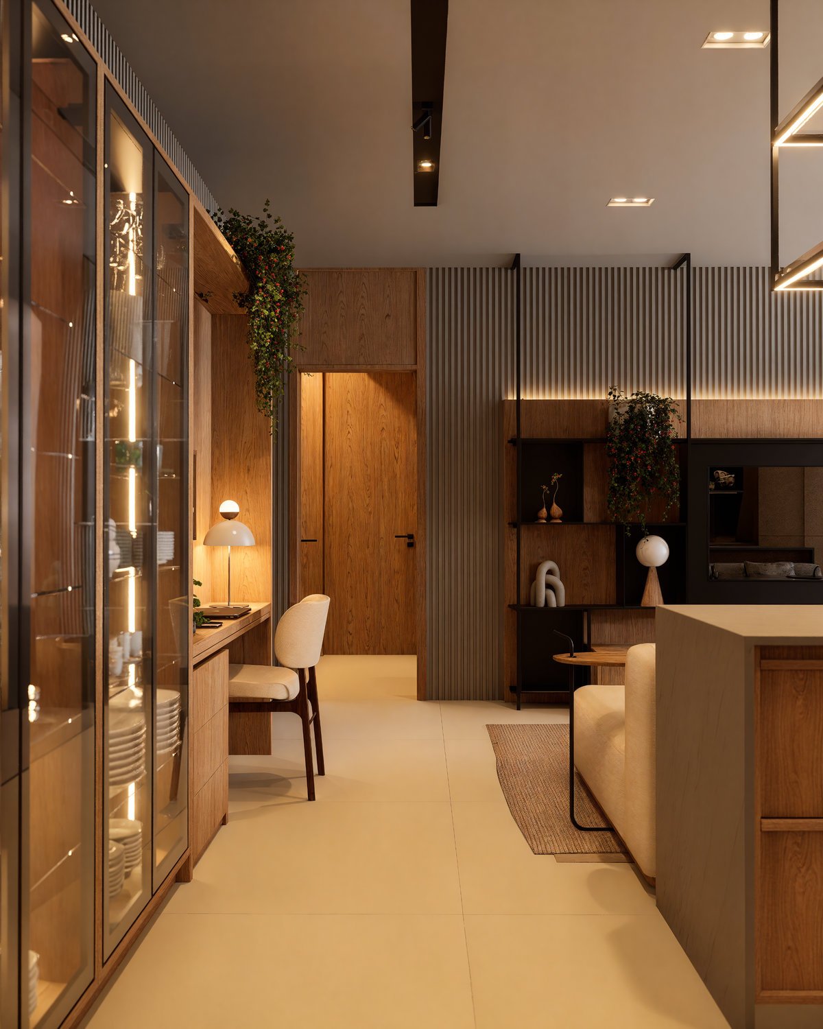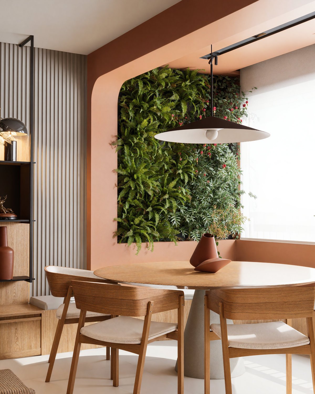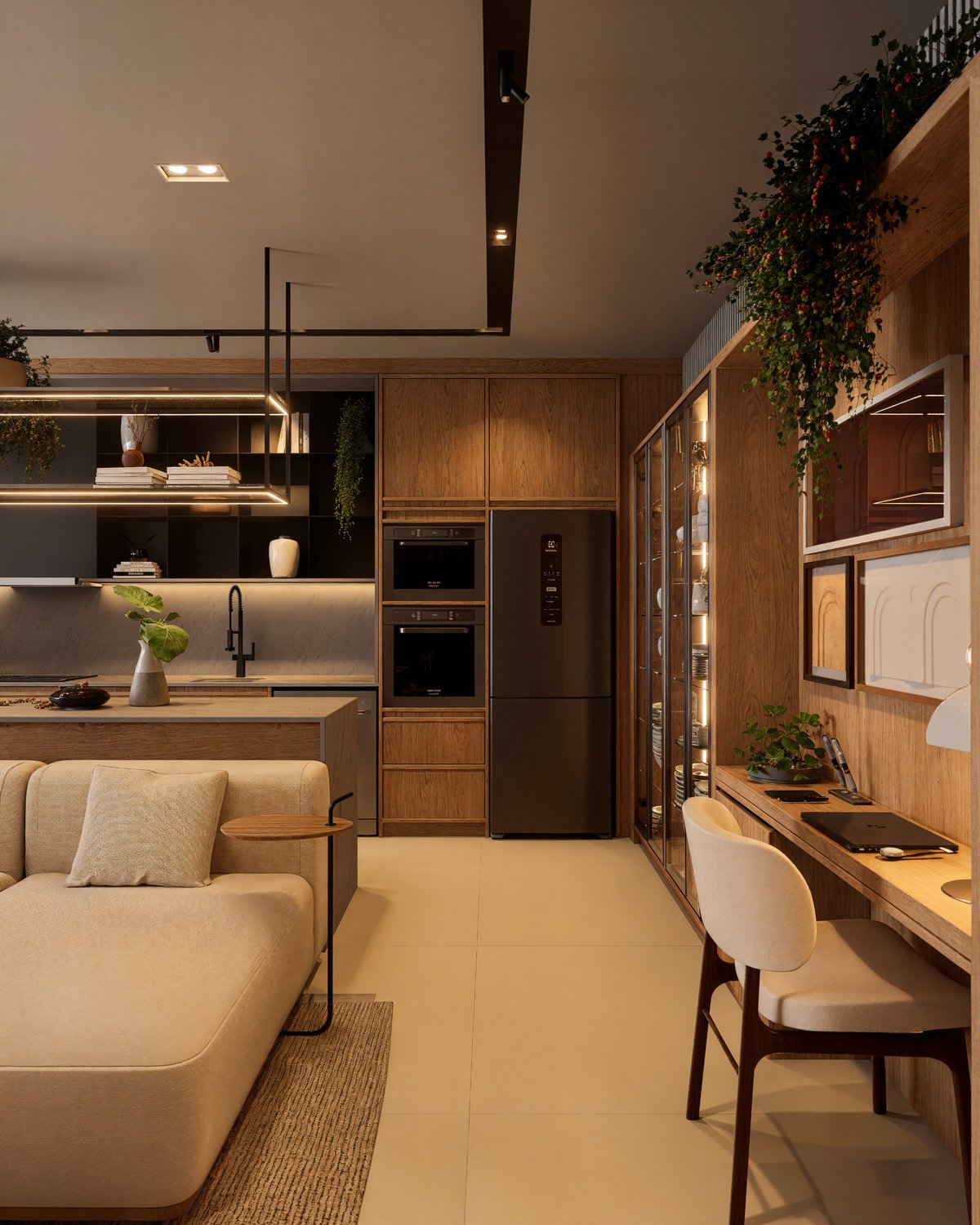 Neste projeto, apostamos em tons terrosos e madeira natural para aquecer o espaço, criando uma atmosfera acolhedora. O jardim vertical e as folhagens naturais trazem frescor e conexão com a natureza, equilibrando a paleta neutra.