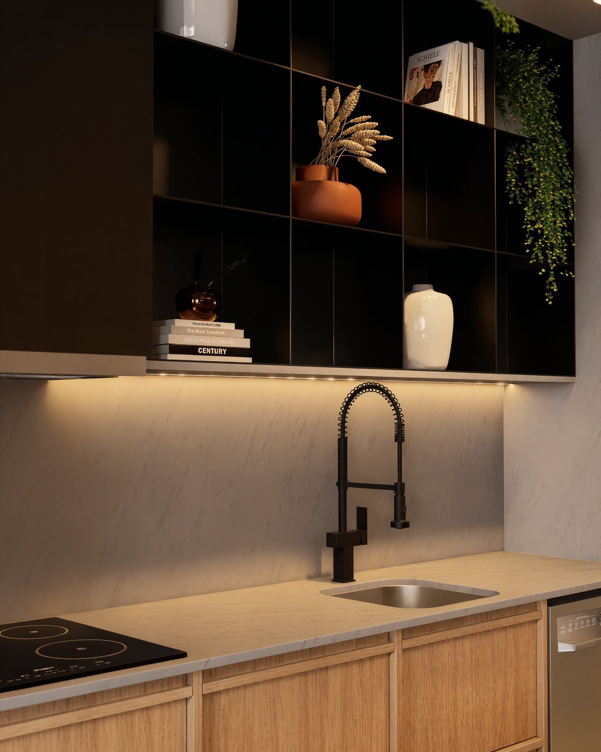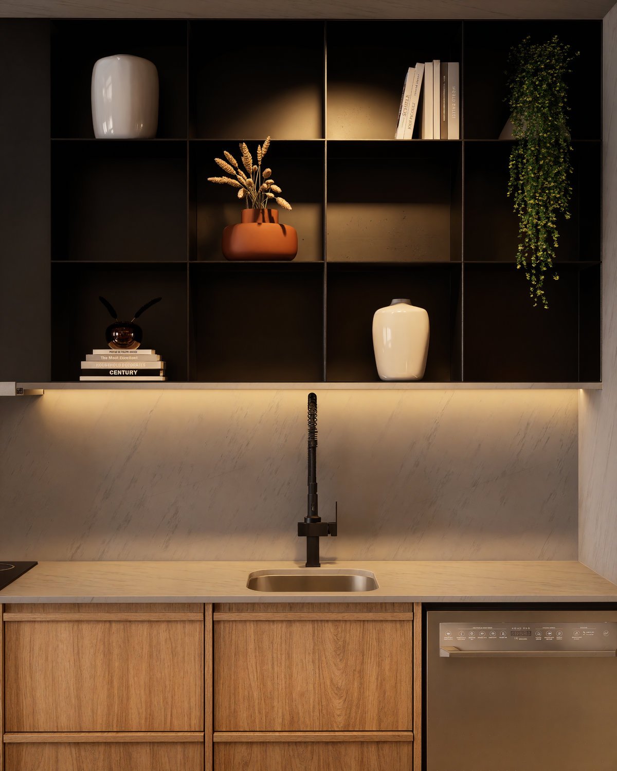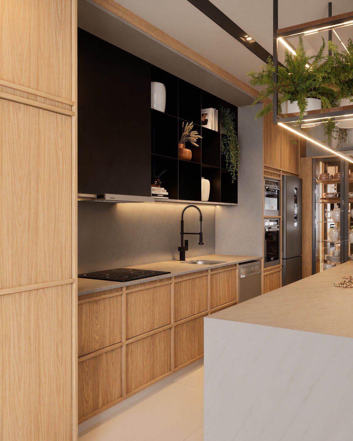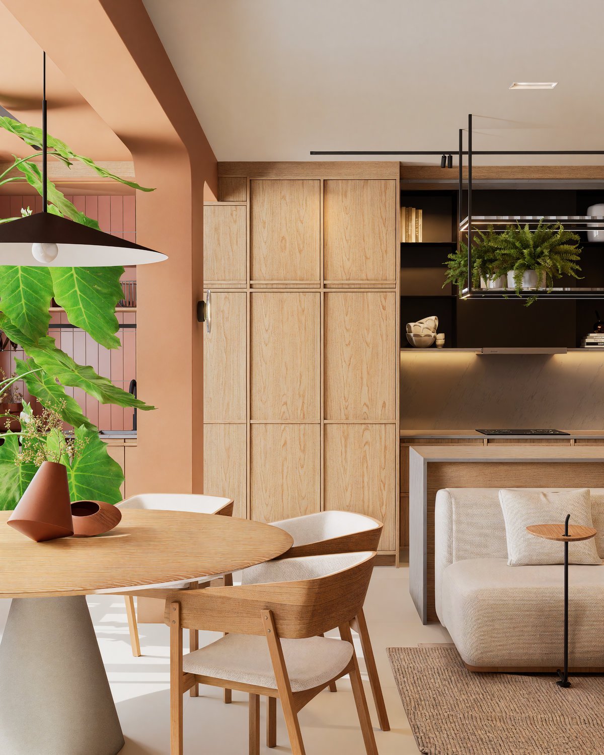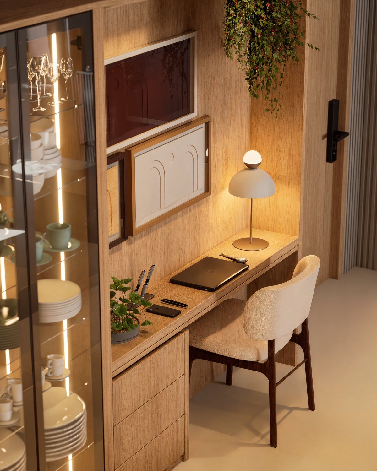 Neste projeto, apostamos em tons terrosos e madeira natural para aquecer o espaço, criando uma atmosfera acolhedora. O jardim vertical e as folhagens naturais trazem frescor e conexão com a natureza, equilibrando a paleta neutra.