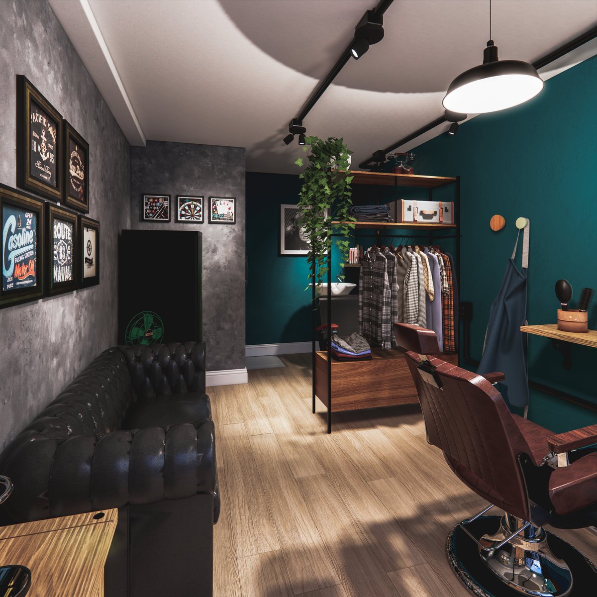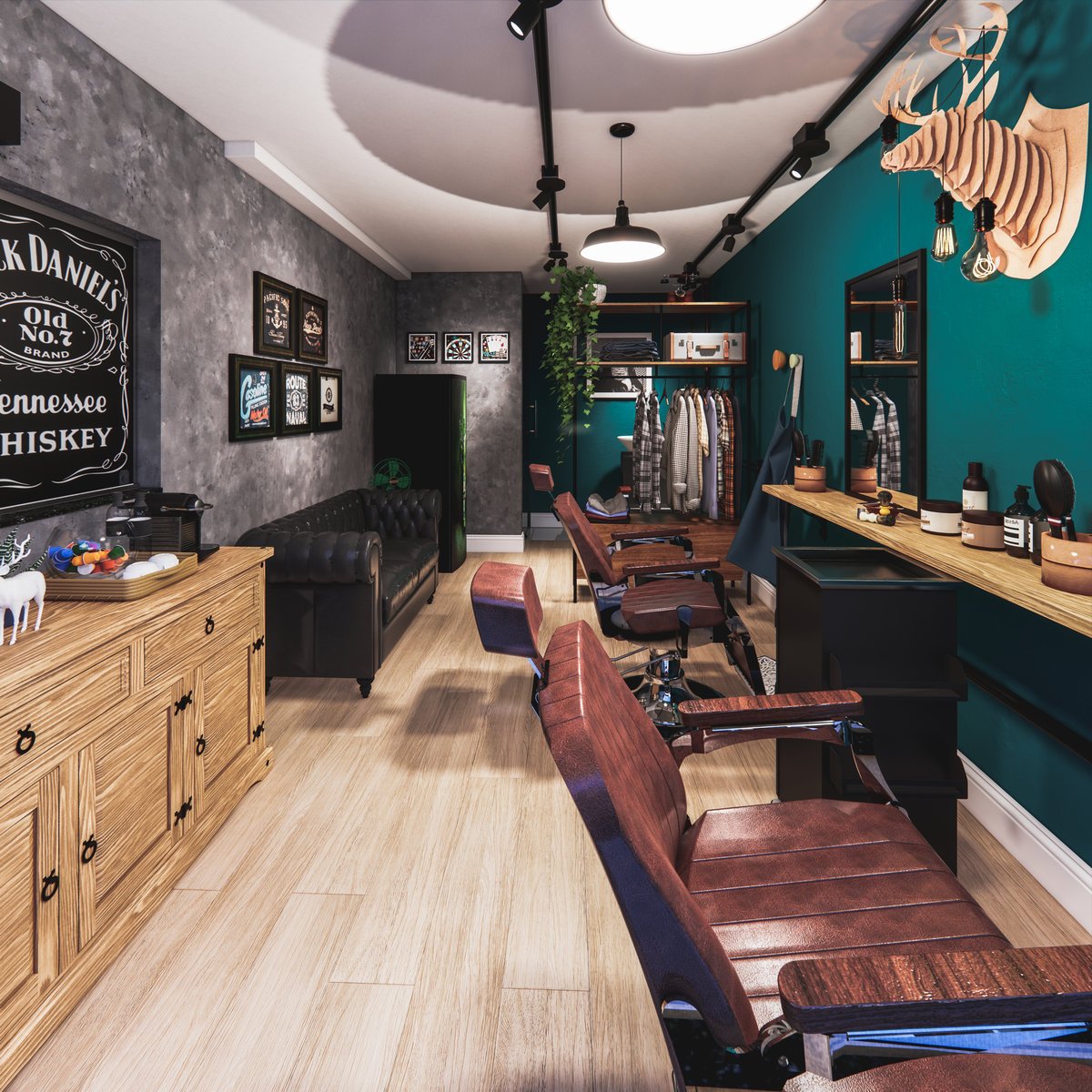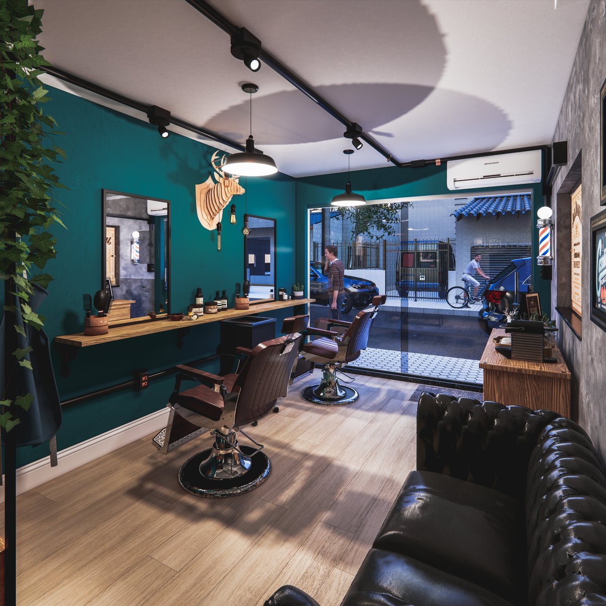Barbearia com personalidade! Aqui, a paleta de cores foge do convencional e traz um toque de ousadia e estilo. O verde petróleo, o cimento queimado e a madeira se unem para criar um ambiente masculino, acolhedor e cheio de atitude — um espaço que traduz autenticidade em cada detalhe.