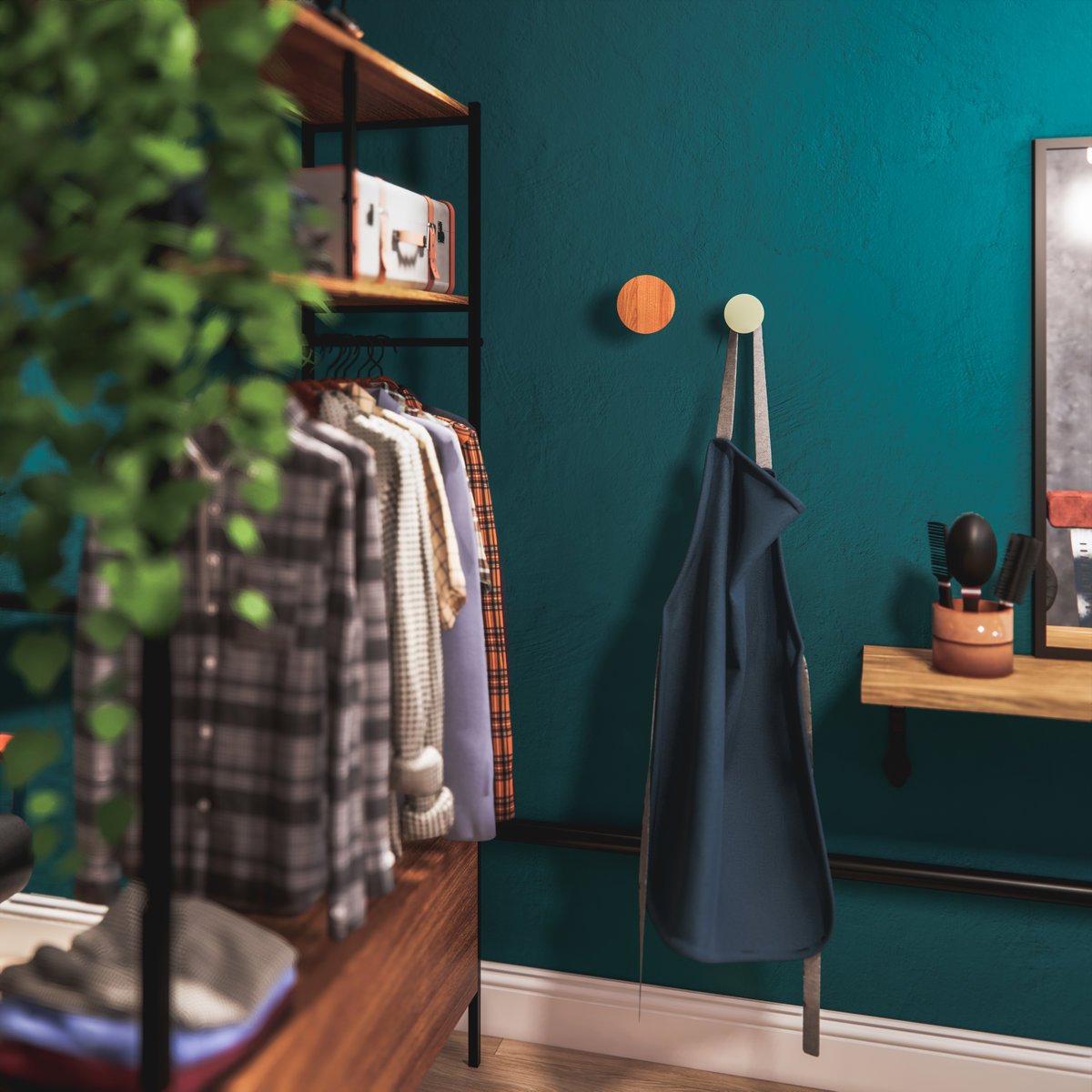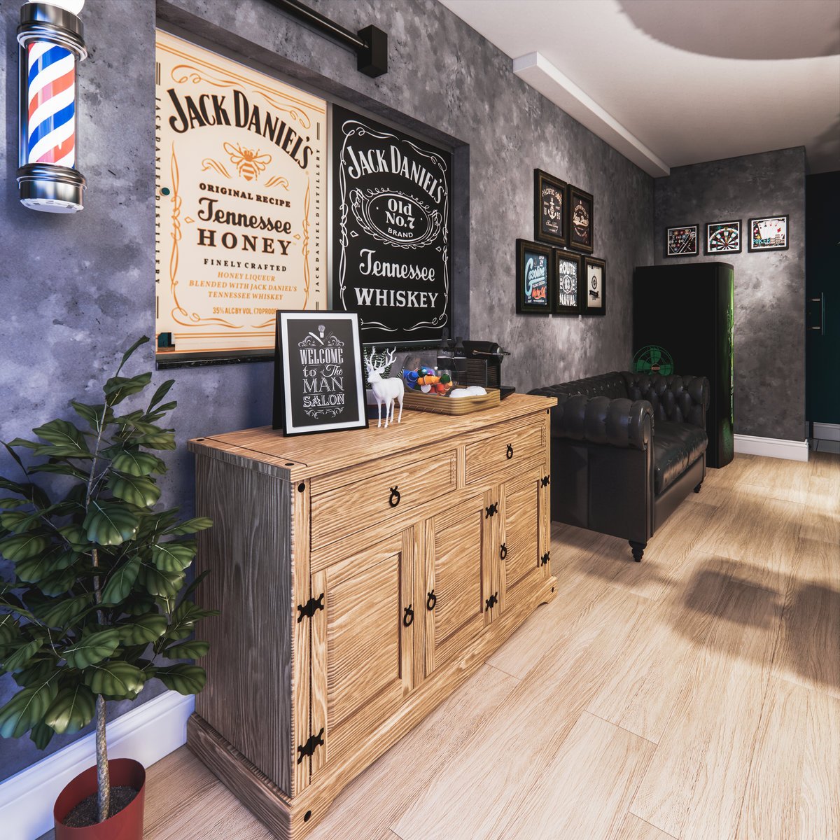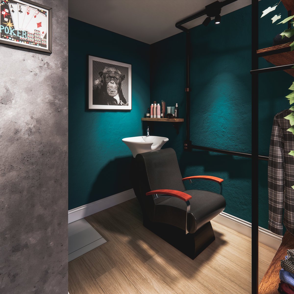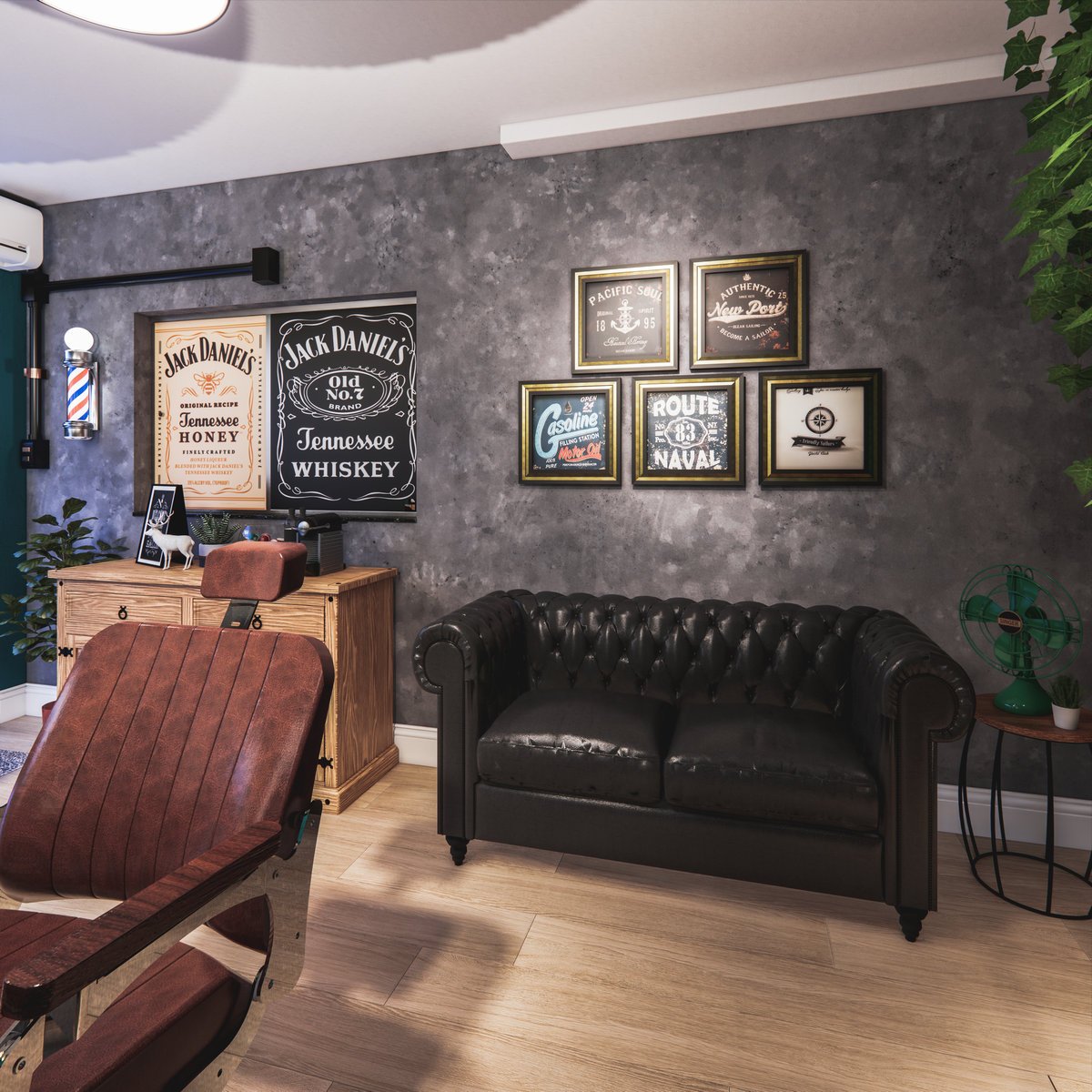 Barbearia com personalidade! Aqui, a paleta de cores foge do convencional e traz um toque de ousadia e estilo. O verde petróleo, o cimento queimado e a madeira se unem para criar um ambiente masculino, acolhedor e cheio de atitude — um espaço que traduz autenticidade em cada detalhe.